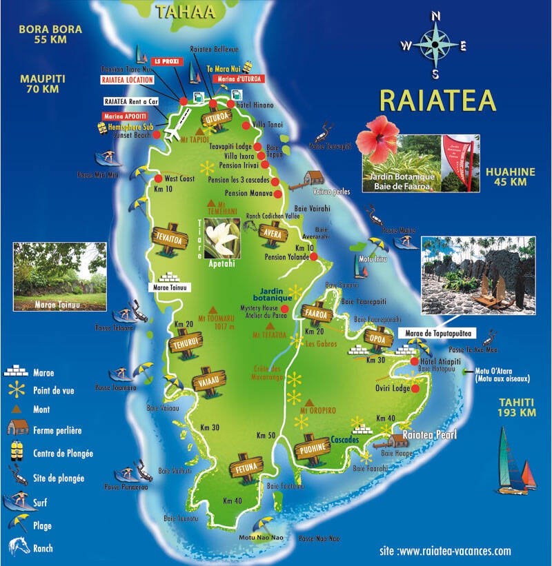Raiatea, l'une des îles centrales de la Polynésie française, situé aux îles sous le vent, est souvent surnommée "l'île sacrée". Cette désignation provient de son importance culturelle et spirituelle pour les Polynésiens. En effet, Raiatea est le berceau de la culture polynésienne, où se trouvent des sites sacrés, des temples anciens et des vestiges de traditions ancestrales. La beauté naturelle de Raiatea est éblouissante. Avec ses paysages luxuriants, ses montagnes majestueuses et ses eaux cristallines, elle offre une expérience inoubliable à ses visiteurs. Les plages de sable fin, bordées d'une végétation tropicale, invitent à la détente et à l'évasion. Raiatea est également le point de départ pour explorer les merveilles de l'océan Pacifique. Les excursions en bateau vers les îles environnantes, comme Tahaa, font partie des expériences incontournables. Ces excursions permettent de découvrir des récifs coralliens colorés et une faune marine riche, idéale pour la plongée avec tuba ou la plongée sous-marine. En parcourant l'île, on peut visiter le marae, un lieu sacré dédié aux ancêtres et aux divinités, et en apprendre davantage sur l'histoire fascinante de cette île. Les habitants de Raiatea sont réputés pour leur chaleur et leur hospitalité, ajoutant une touche personnelle à toute visite. Pour ceux qui s’intéressent à la culture, participer aux festivals locaux et goûter à la gastronomie polynésienne, avec ses saveurs exotiques et ses ingrédients frais, est essentiel. En somme, Raiatea est une destination à ne pas manquer pour quiconque souhaite comprendre et apprécier la richesse de la culture polynésienne tout en profitant de la beauté naturelle époustouflante des îles.